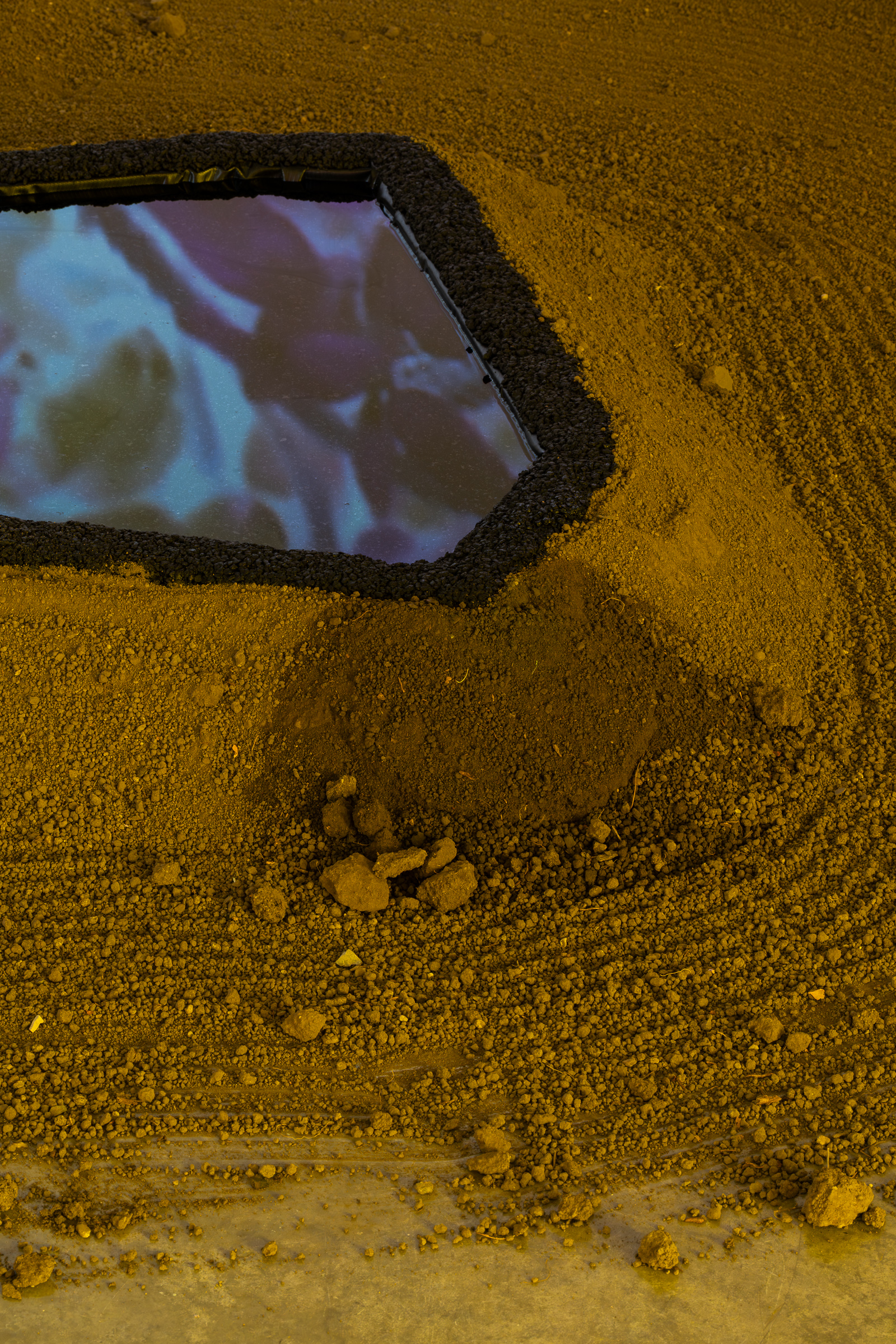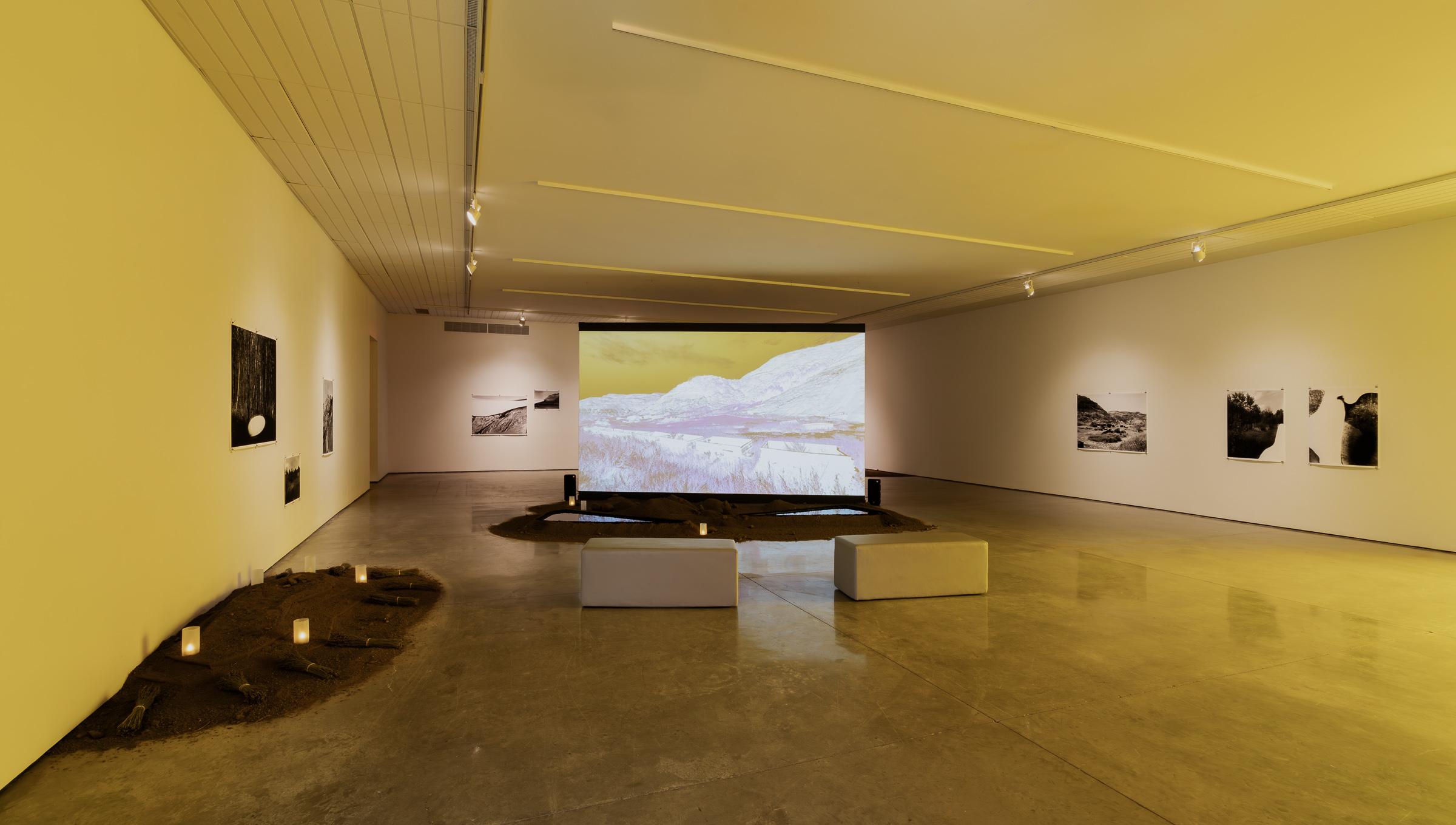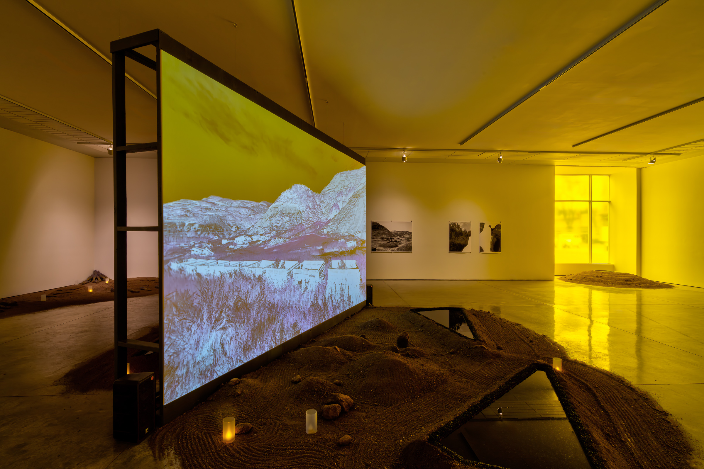 Shaping movement through the gallery, soil is piled and raked into shapes that simultaneously recall rock gardens and the scars of the strip mine. Around the stepped and terraced earth, bundles of lavender are placed in votive offerings, gestures of appreciation for the ancient fossilized life that has fueled photography and innumerous other chemical processes. The lavender’s floral scent, enhanced by lavender oil in a trickling fountain, diffuses Niépce’s original developer into the atmosphere of the exhibition.
