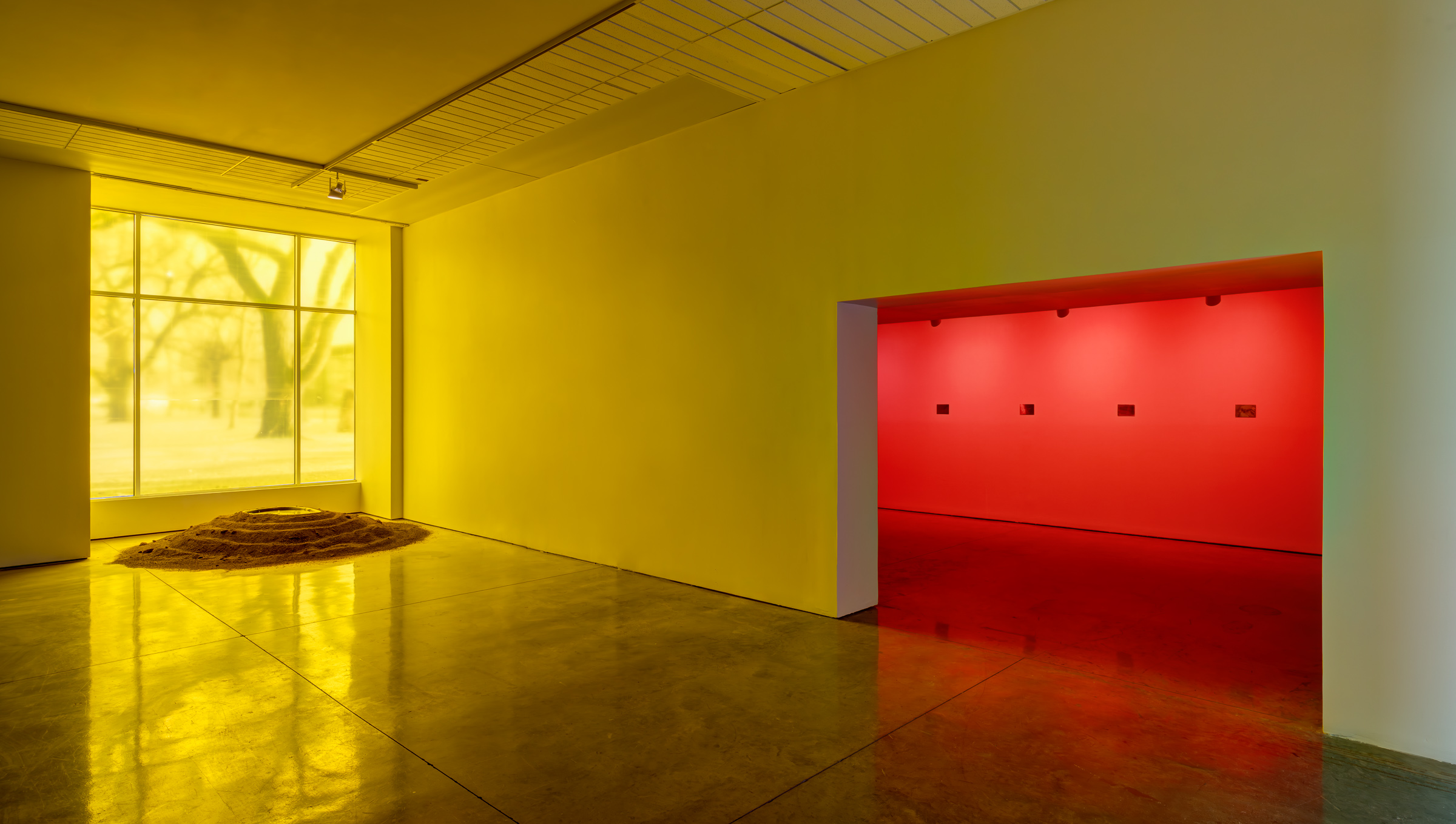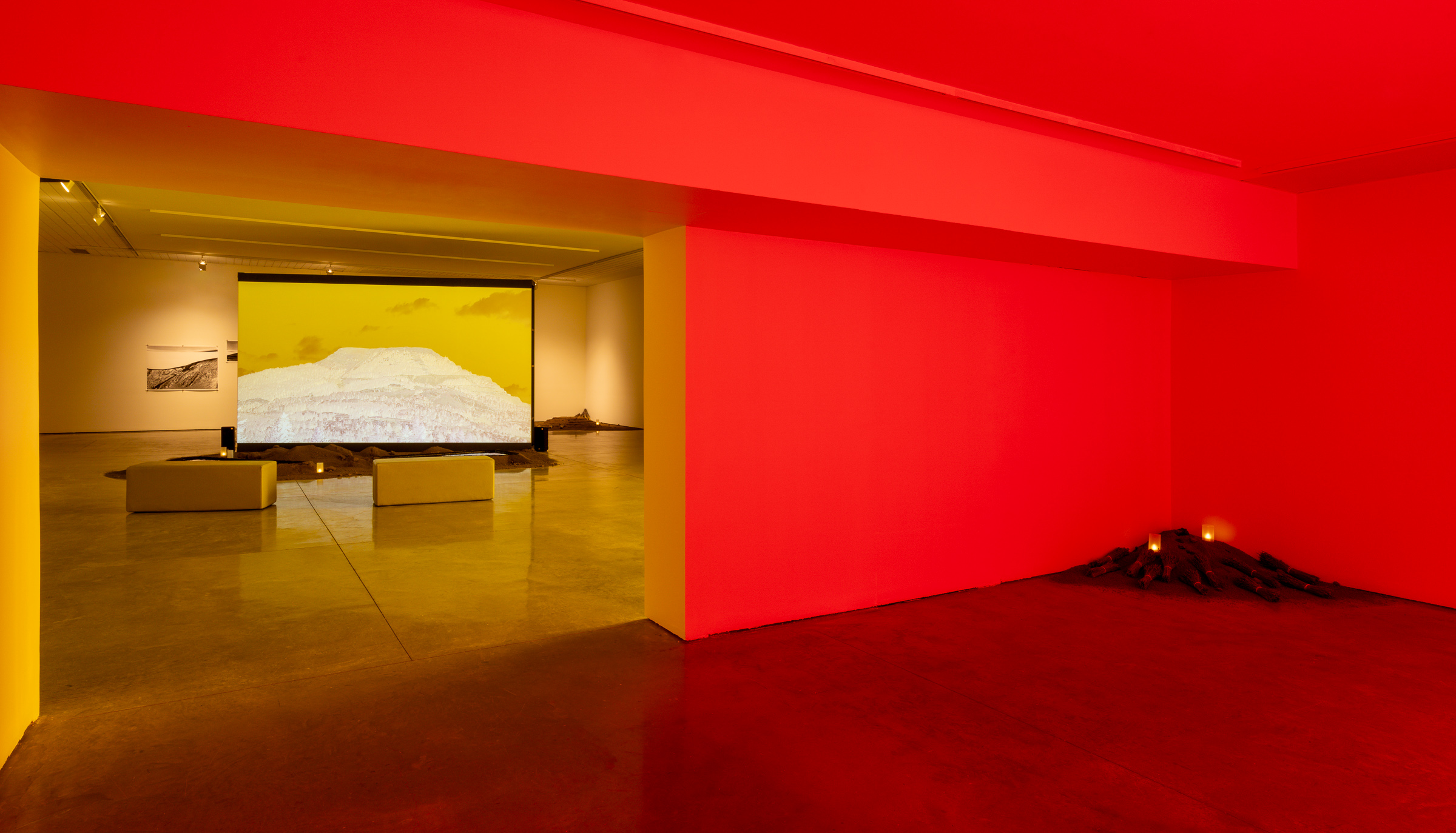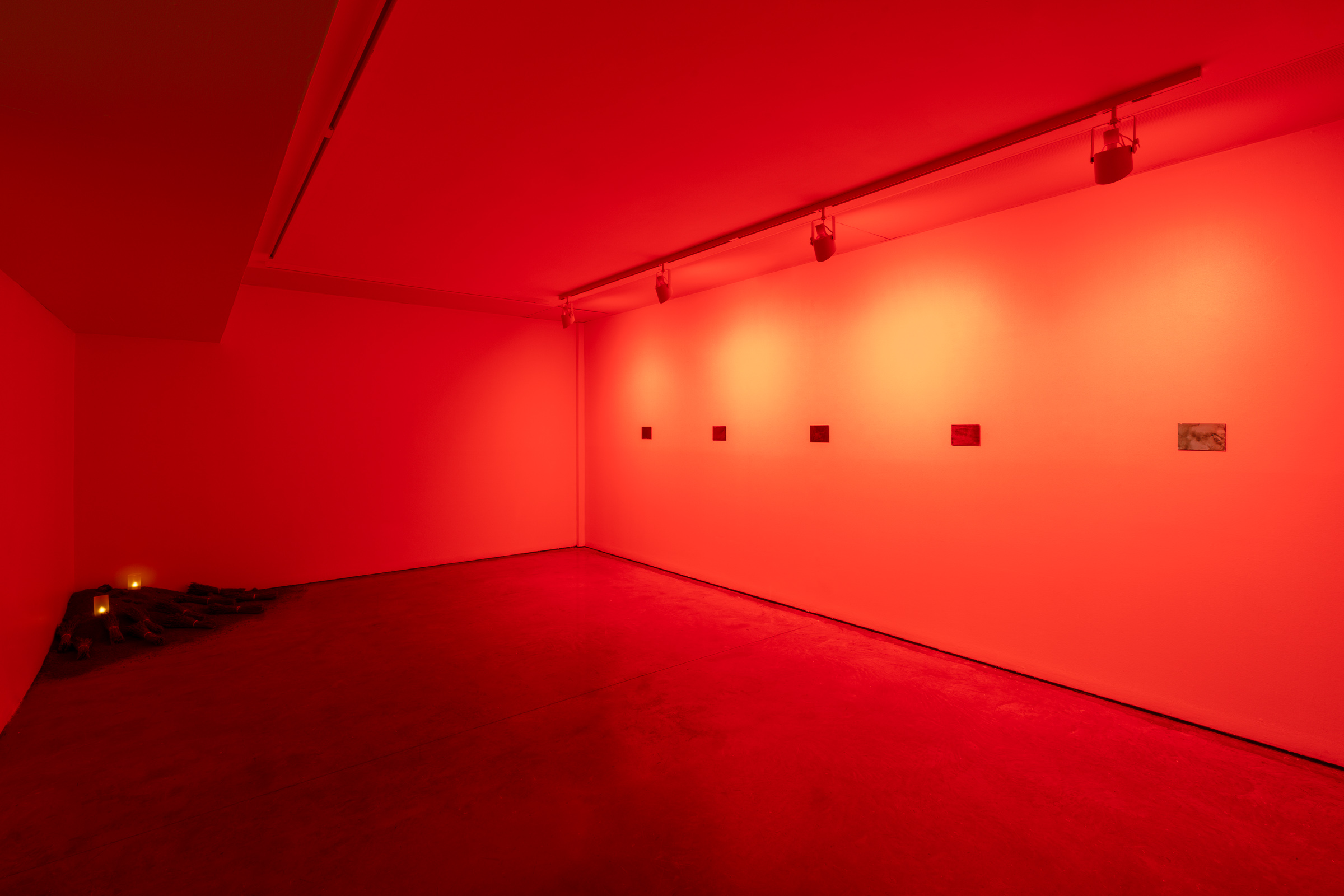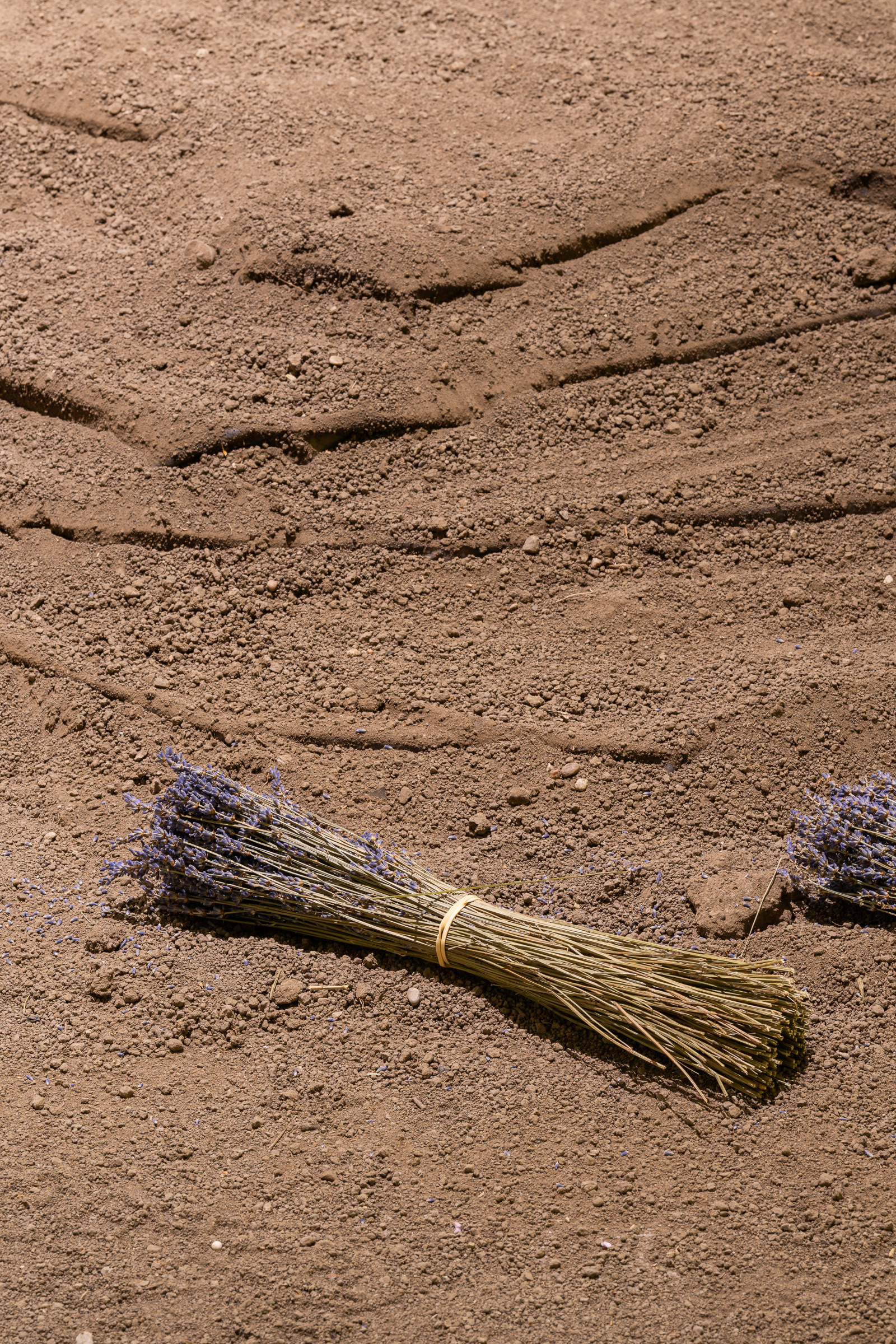 Shaping movement through the gallery, soil is piled and raked into shapes that simultaneously recall rock gardens and the scars of the strip mine. Around the stepped and terraced earth, bundles of lavender are placed in votive offerings, gestures of appreciation for the ancient fossilized life that has fueled photography and innumerous other chemical processes. The lavender’s floral scent, enhanced by lavender oil in a trickling fountain, diffuses Niépce’s original developer into the atmosphere of the exhibition.