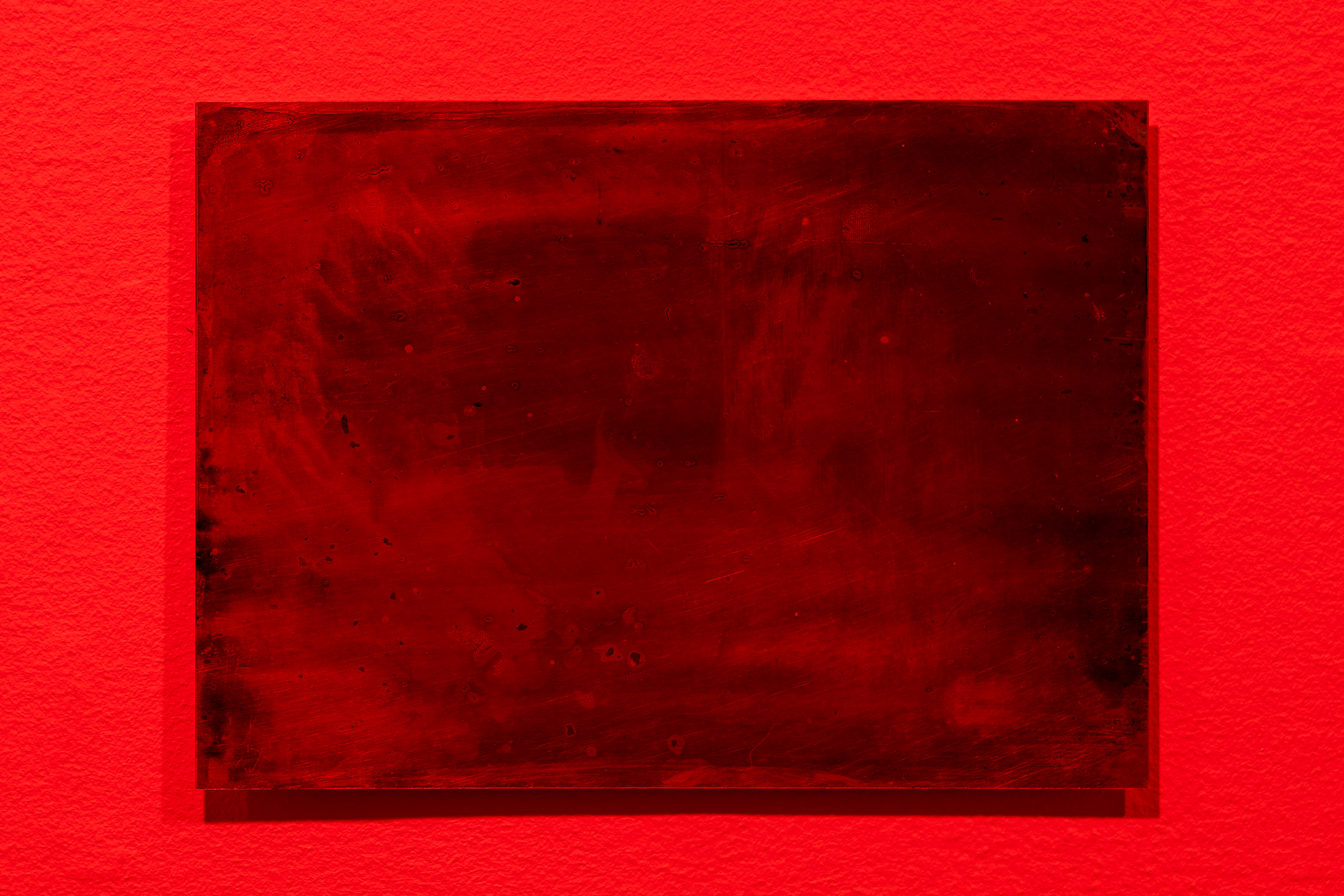 In dialogue with the entangling of photographic history, extraction, and the mythology of fossil fuels, Valladares creates images in a process similar to Niépce’s Heliographs. Small metal plates, coated with bitumen, bare the faint traces of southern Alberta landscapes and the traces left by the coal mining industry. Valladares’ dialogue with the origins of photography brings to light the oft forgotten connections between image-making and the combustion of buried life. In this instance, the camera and the combustion engine are not so different. Both are contained systems, exposing fossil fuels to fire (whether that of the sun or the combustion chamber) to achieve the desired result. Valladares’ photos are membranes of “buried sunshine”. Once dug up, this petrochemical ancient life undergoes a kind of double exposure, formed by the sun in its first life to be reconstituted onto a plate millions of years in the future for the sun to alter its form once again.